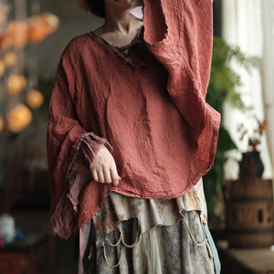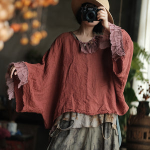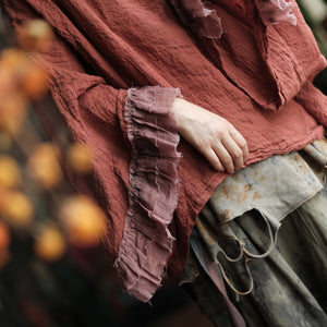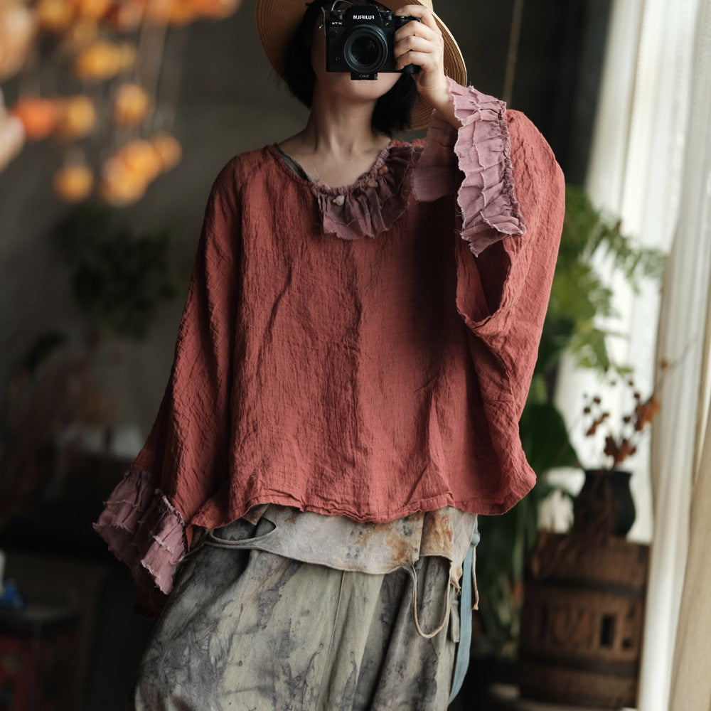 100% Linen Ruffled Hem Women Pullover with Natural Stones Details & Color Blocked Design 250605s 2374
